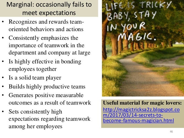 No matter how you look at it its in everyones best interest to come into a performance appraisal prepared. Put meetings in the Outlook calendar and report back with a meeting summary to the floor manager. Of teamwork in the department and company at large Is highly effective in bonding employees together Is a solid team player Builds highly productive teams Generates positive measurable outcomes as a result of teamwork Sets consistently high expectations regarding teamwork.