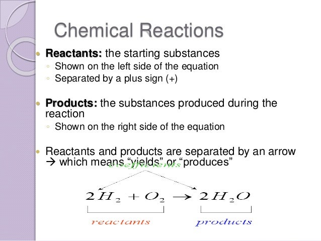 They are separated by an arrow which indicates the direction and type of the reaction. A single reactant breaks down to yield two or more products. The reactants for photosynthesis are light energy water carbon dioxide and chlorophyll while the products are glucose sugar oxygen and water.